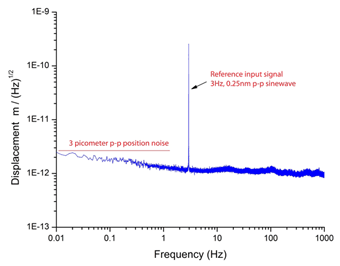 The Nano-P35 closed-loop response to a 3nm peak-to-peak square wave input signal, measured with USB digital interface. Notice the ultra-low, sub-nanometer stability of the system over the time scale. Similar products offered by other companies are unable to achieve such low-noise results. The Nano-P uses a true flexure guiding mechanism and low-noise sensors to achieve high-resolution positioning. |