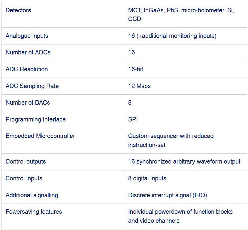 The IDE8420 is a radiation tolerant control and acquisition integrated circuit (IC) for large area hybrid imaging focal plane arrays (FPA). It is designed for use in high speed, large area focal plane applications, making it particularly suitable for MCT or InSb based applications in Earth observation and security. It integrates the functionality that is usually found in discrete proximity electronics into one radiation tolerant SoC with operating temperature between -40°C and +85°C.